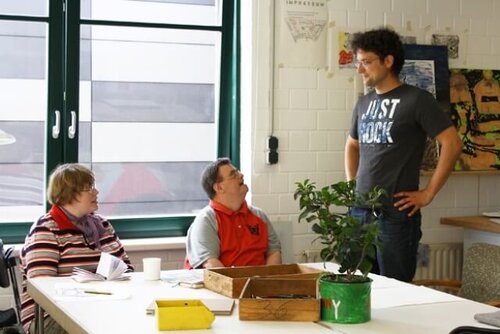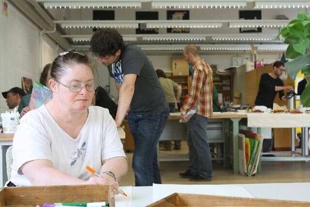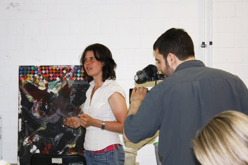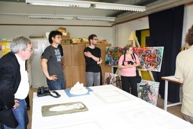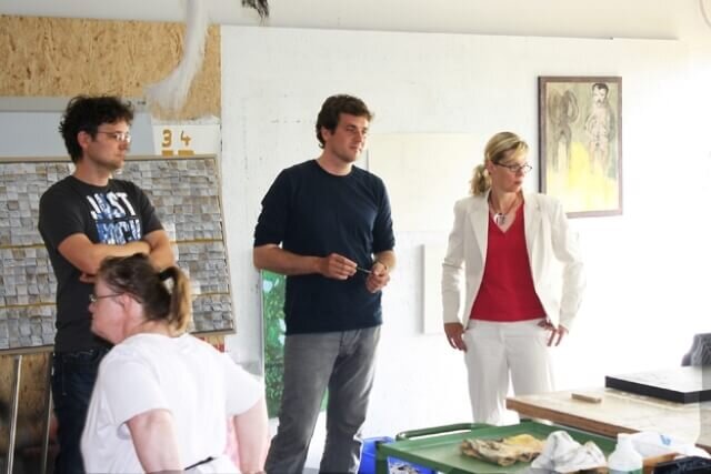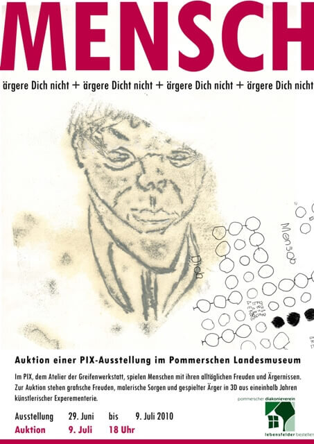 „Heute waren viele Leute in unserem Atelier. Sie waren über unsere Bilder, die wir geschaffen haben, sehr zufrieden. Am meisten gefielen den Besuchern Bilder von Jorinde Otto und mein Teebeutelbild. Ich bin stolz darauf. Es waren Leute von der Ostsee-Zeitung und Land & Leute hier. Es gab ein kleines Buffet, Kaffee und Tee. Die Leute waren sehr interessiert. Wenn man bedenkt, dass die Bilder von behinderten Menschen geschaffen worden sind. Ich bin stolz, dass ich im Fernsehen zu sehen bin und dass ein Foto in unserer Zeitung drin steht. Ich war sehr aufgeregt. Man hat nicht alle Tage Besuch von der Zeitung und vom Fernsehen. Es war schon was Besonderes. Man wird berühmt! Es ist wichtig, dass unsere Arbeit geachtet wird.“ So Beate Wurster über das Zusammentreffen von Journalisten, Künstlern und weiteren Interessenten zu der kommenden PIX-Ausstellung „MENSCH ärgere dich nicht“ im Pommerschen Landesmuseum vom 29.06. bis 09.07.2010. Die Informationsveranstaltung im Atelier vermittelte einen Vorgeschmack auf die künftig zur Schau gestellten Malereien, Grafiken und Objekte. Als Finissage lädt PIX, das Atelier der Greifenwerkstatt, alle Kunstbegeisterten zur Auktion am 09.07.10 um 18 Uhr in den Lichthof des Museums ein.