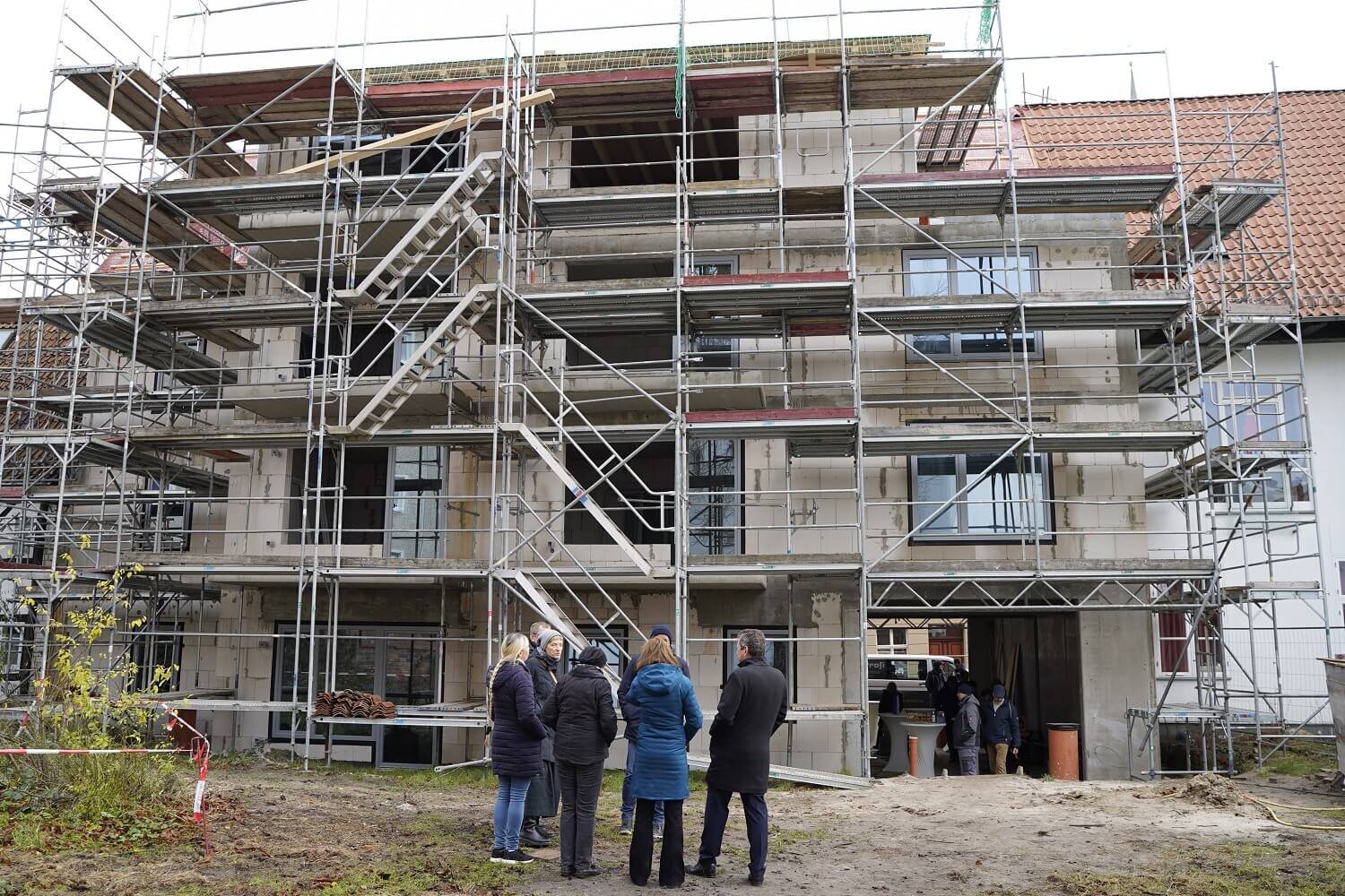In der Stralsunder Mönchstraße 4 errichtet der Pommersche Diakonieverein ein Mehrfamilienhaus mit sieben Mietwohnungen und schließt damit eine seit langem bestehende Baulücke. Die Bauarbeiten am Neubau des Wohnhauses sind in den letzten Monaten soweit vorangeschritten, dass noch kurz vor dem Weihnachtsfest, am 18. Dezember, Richtfest gefeiert werden konnte.