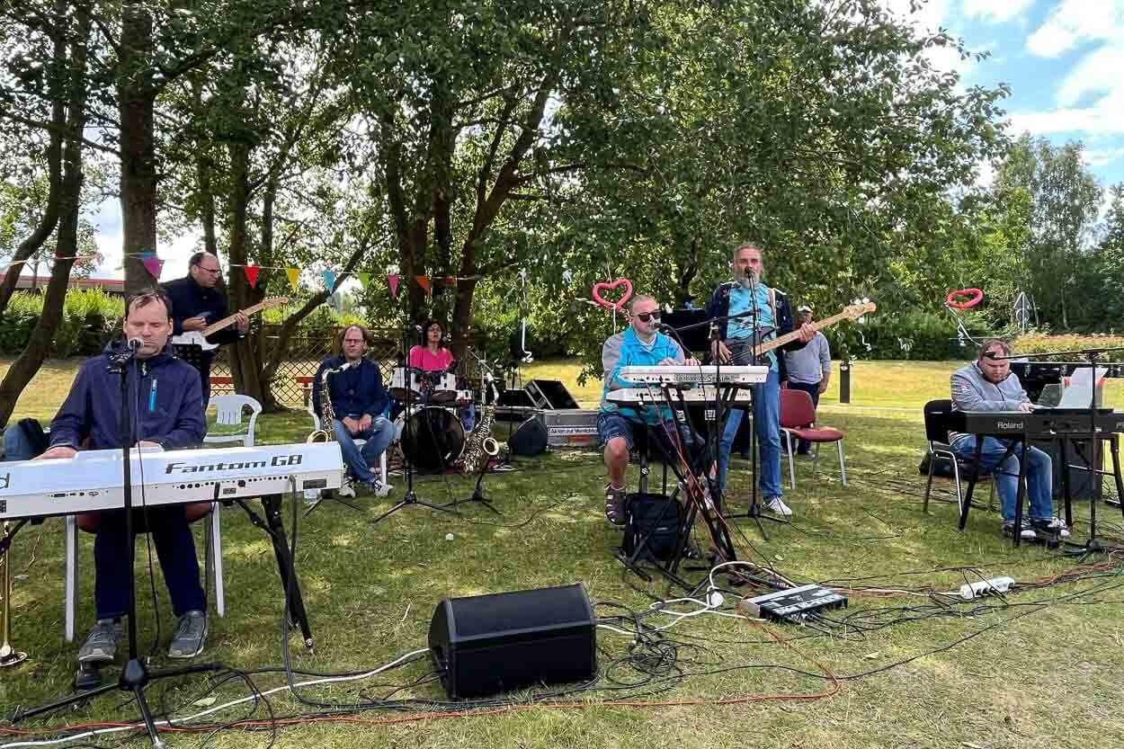 Endlich wieder eine "freshe" Erfahrung, hört man leise in der Menge, und somit ist der perfekte Start für eine wunderbare und gesegnete Zeit zusammen gemacht. Nach Fürbitten, Gebet und einem herzlichen Segen gab es live Musik von Seeside, der Band der Greifenwerkstatt, die kürzlich erst den Band Contest inklusiv gewonnen hat. Kurz vor ihrem Auftritt bei Andrea Bergs Heimspiel-Open Air erfüllen sie auch den Helmshäger Berg mit tollen Klängen und viele fröhliche Menschen strömen unter einem strahlend blauen Himmel auf die Tanzfläche.