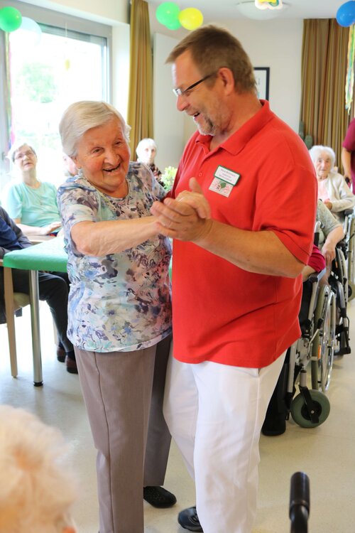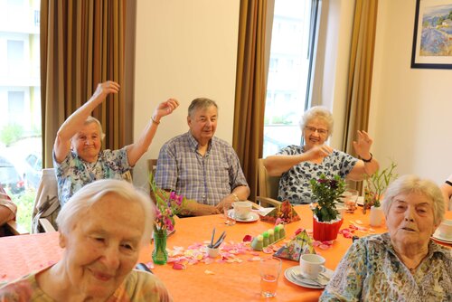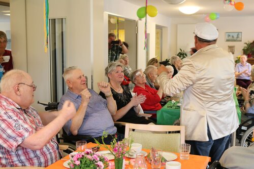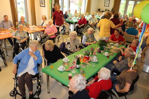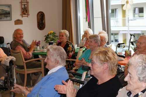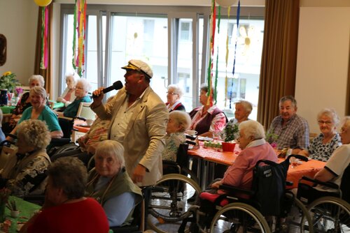 Das diesjährige Sommerfest sollte in der Soldmannstraße mit der Tagespflege im Pflege- und Therapiezentrum, dem Senioren- und Wohnzentrum am botanischen Garten, der Sozialstation und dem altersgerechten Wohnen das größte Fest des Jahres mit vielen verschiedenen Möglichkeiten der Beschäftigung werden. Es waren ein gemeinsamer Gottesdienst mit anschließenden Kaffee trinken, eine Kreativstraße, sowie Partymusik mit dem "Singenden Seemann" in mehreren Pavillions, dem großen Festzelt und Sonnenschein geplant. Leider war der 21.06.18 der Tag mit dem schlechtesten Wetter der letzten Wochen. Kurzfristig wurden das Festzelt, die Pavillions und Bierzeltgarnituren abbestellt. Auf Grund der nicht vorhandenen großen Räumlichkeiten wurde die Veranstaltung geteilt. Die Tagespflege feierte mit den Bewohnern aus Haus C in den Räumlichkeiten Haus A und das SWZabG im Haus B. Die Kreativstraße mit den Häkelfrauen, Glücksrad, Büchsen werfen, Malstraße, Verkauf und Verkostung von selbst gemachter Marmelade, Körbe flechten, Gespräche mit Herrn Walther fand großen Anklang in der Tagespflege, mit Partymusik aus dem CD-Player. Im SWZ spielte zur Unterhaltung der Bewohner und Gäste der "singende Seemann" zum Mitsingen und Tanzen groß auf. Einige Bewohner aus Haus C wechselten die Location, um an beiden Partys teilzunehmen.