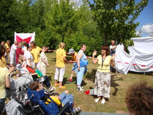 Bevor zum Kaffee und Kuchen eingeladen wurde, gab es eine ganz besondere Überraschung, die Vorhänge fielen und zwei behindertengerechte Schaukeln kamen zum Vorschein! Die Freude war riesengroß! Es wurde geklatscht, gesungen und getanzt - ein wunderschöner Nachmittag ging viel zu schnell zu Ende!