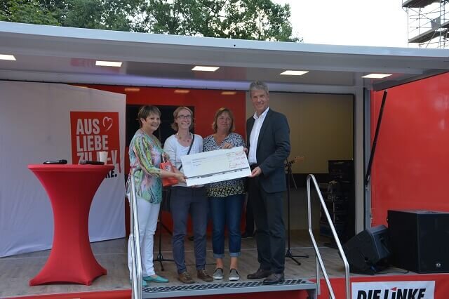 So konnten Mignon Schwenke und Helmut Holter am Ende des Friedenslaufs einen Scheck über 465 Euro überreichen – und zwar für das Projekt „Komm mit! Wir zeigen dir Greifswald“, ein Willkommensbuch für geflüchtete Kinder, erarbeitet von Kindern der Grundschule Greif gemeinsam mit vielen ehrenamtlichen Helferinnen. Dr. Anja Eberts (BÜRGERHAFEN) und Anke Wiemer (Schulsozialarbeiterin) freuten sich sichtlich über die Anerkennung des tollen Projekts.
