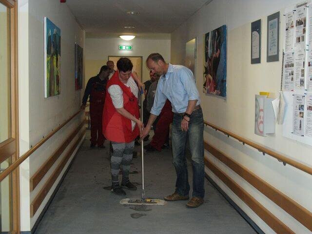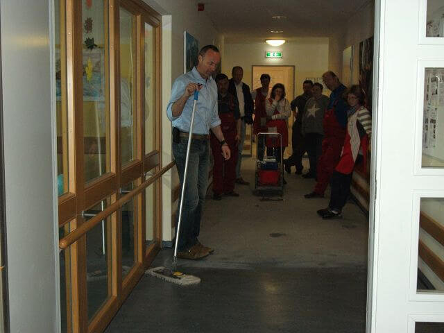Regelmäßige Wiederholungen, die Festigung und der Ausbau von fachlichen Kenntnissen sind den Teams der Hauswirtschaft sehr wichtig. Darum wurden für die Betriebsstätten Feldstraße, Helmshäger Berg und Züssow drei Schulungstermine organisiert. Herzlichen Dank an Herrn Carbe, Fachwirt für Reinigungs- und Hygienemanagement und Herrn Schiller von der Firma Lloyd. Schulungsthemen sind: die Anwendung von Dosieranlagen und verschiedener Reinigungs- und Pflegemittel, unterschiedliche Reinigung und Pflege der einzelnen Fußböden wie z. B. Linoleum, Holz oder Steinfliesen. Welches Reinigungsmittel ist richtig, welche Dosierung muss beachtet werden? Manche Fußböden, wie z. B. die der Keramikwerkstatt, stellen uns vor besondere Herausforderungen. Wichtig: grundsätzlich häufiges Wechseln der Wischmöppe und nebelfeuchtes Wischen.