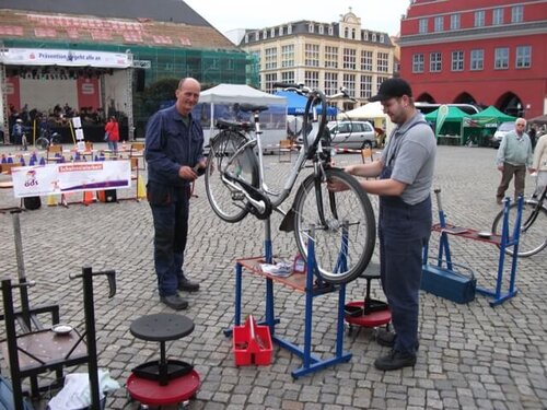 Die Fahrradwerkstatt war mit vier Mitarbeitern vertreten. An unserem Stand wurden kleine Reparaturen an Licht und Bremsen durchzuführen. Das Angebot wurde von den Greifswaldern gut angenommen und wir konnten einige Tipps und Tricks zum Thema der Fahrradsicherheit geben.