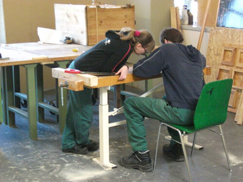 …und die Ergebnisse zu sehen macht Stolz. Diese Erfahrung machten die Mitarbeiter und Mitarbeiterinnen der Tischlerei aus dem Arbeits- und Berufsbildungsbereich, nachdem Schritt für Schritt auf erlerntes aufgebaut werden konnte. So begannen wir mit Maßeinheiten und Messgeräten und kämpften uns mit Hilfe von Säge, Stechbeitel und Co. bis zu Holzverbindungen vor. Mit großem Eifer und Teamplay wurden die Ergebnisse immer besser, sodass auch Übungsstücke mit hoher Schwierigkeit fachgerecht ausgearbeitet wurden.