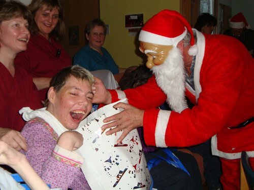 Der Weihnachtsmann brachte für jeden Bewohner Geschenke, alle liebevoll eingepackt. Es wurden Lieder gesungen und eine Mutti spielte auf dem Keyboard.
