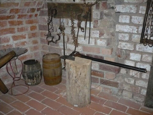 Wir saßen im Rittersaal der Burg, besichtigten eine Folterkammer und erfuhren so manche interessante Sachen aus vergangenen Zeiten. So erzählte uns zum Beispiel Frau Penzlin Geschichten über Ritter und wie sie dort gelebt haben. In der Folterkammer, zu der sehr steil Treppen führten, zeigte sie uns eine Streckbank und eine Daumenquetsche. 3 von uns waren so mutig und haben ihre Daumen „geopfert“. Der Zungenknebel diente dazu, dass man die Schreie der Menschen beim Foltern nicht hörte. Im Verlies sahen wir Eisenmasken, die die Augen verdecken sollten, weil sich die Menschen vor dem bösen Blick der Hexen fürchteten. Die Hexen wurden im Verlies hinter einer schweren Holztür in Nischen eingesperrt und an Hand- und Fußgelenken fest gekettet.