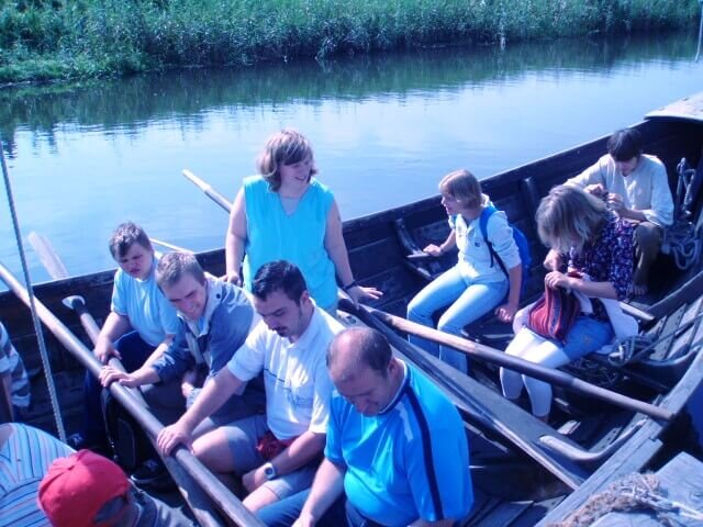 Im Ukranenland Torgelow wurden nach archäologischen Befunden slawische Block-, Pfosten- und Flechtwandhäuser des neunten und zehnten Jahrhunderts in Originalgröße rekonstruiert. Wir nahmen an einer spannenden Führung teil und begaben uns anschließend auf das Schiff Svantenit (Bauweise um 1100). Bei der anschließenden Flussschifffahrt auf der Uecker mussten wir als „Besatzung“ kräftig anpacken und rudern. Den Schlagrhythmus gab unser strenger Kapitän vor. Das war am Anfang nicht leicht. Den „Bogen“ hatten wir dann aber schnell raus.