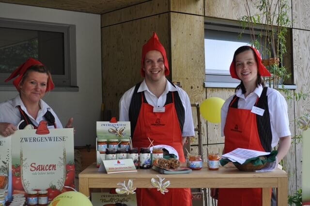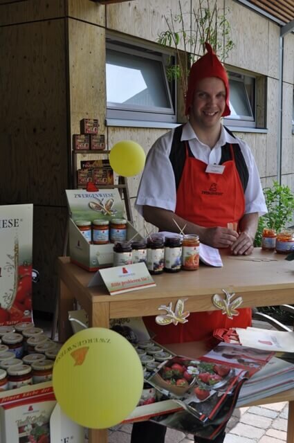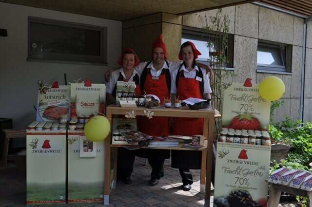 Das Wetter spielte mit und es machte gleich doppelt Freude unseren Kunden die leckeren Sachen zur Verkostung anzubieten. Verkleidet mit Mütze und Schürze waren wir für 4 Tage die Zwerge auf dem Hof und hatten somit volle Aufmerksamkeit. In der Zwischenzeit gibt es ca. 100 Sorten an Fruchtaufstrichen, Senfspezialitäten, Tomatensoßen und vegetarischen Brotaufstrichen von der Firma. Der Zwergenhut auf dem Deckel der Gläser bedeutet: Garantiert von Zwergenwiese hergestellt.