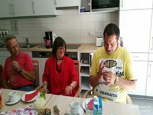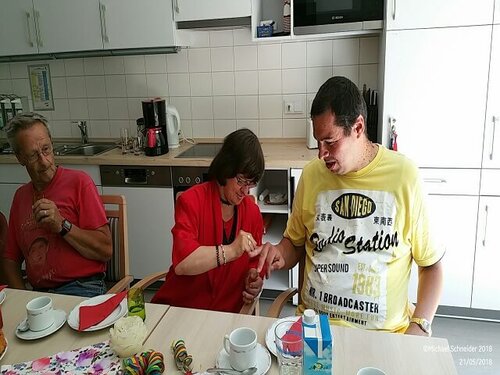 Mit befreundeten Bewohnern wurde eine kleine Feier ausgerichtet. Mit sehr viel Liebe zum Detail bereitete Frau K. die Kaffeetafel vor. Neben Kerzen, Dekoration und einem Rosenstrauß auf dem Tisch durfte die Verlobungstorte nicht fehlen, die von einem