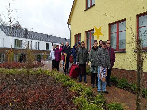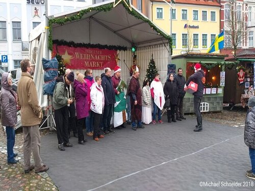 Voller Vorfreude und Aufgeregtheit und zu Fuß, voran der Stern der Weihnacht, ging es zum Markt, wo trotz regnerischem Wetter einige Besucher warteten und das Stück mit großem Interesse verfolgten.
