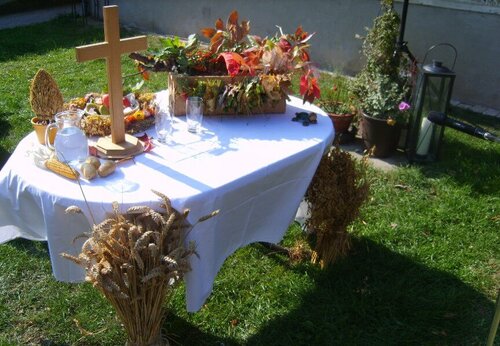 Unter diesem Gesichtspunkt gestalteten Bewohner und Mitarbeiter das Erntedankfest in der Einrichtung. Gemeinsam mit Frau Pastorin Graf wurde ein Festgottesdienst gefeiert. Ein Anspiel der Laienspielgruppe zum Thema gab den Anstoß dazu, darüber nachzudenken, was alles zur Schöpfung Gottes gehört und wofür wir dankbar sein können. In erster Linie geht es beim Erntedankfest natürlich darum, dass alle unsere Arbeit, unser menschliches Bemühen ohne den Segen Gottes nicht die Früchte bringen würde, die wir ernten. Die Schauspieler verdeutlichten, dass Gott die Früchte der Erde für eine reichliche Ernte geschaffen hat, aber auch Sonne und Regen und ebenso Gesundheit und Verstand. Für all das wurde ihm gedankt – mit Gebeten und vielen Dankliedern während des Gottesdienstes, der bei sonnigem Herbstwetter unter freiem Himmel stattfand und so zu einem fröhlichen Beisammensein wurde. Danach gab es verschiedene Obstkuchen, Schmalzschnitten zu Kaffee und Tee und ganz frisch gepressten Obstsaft. Verschiedene Bastelangebote mit herbstlichem Naturmaterial luden zum Mitmachen ein.
