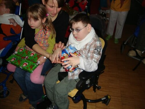 Jeder Bewohner bekommt ein Geschenk. Beim Auspacken helfen Eltern und Mitarbeiter.