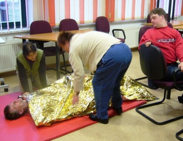 Im Dezember hatten die ersten Mitarbeiter eine Einführung in die Grundlagen der Ersten Hilfe. Sie konnten vieles selbst ausprobieren, wie zum Beispiel die stabile Seitenlage oder auch den Umgang mit einer Rettungsdecke – eine Folie, die in der Ersten Hilfe dazu verwendet wird, verunglückte Personen vor Unterkühlung, Nässe oder Wind zu schützen. Es gilt zu hoffen, dass man nicht in eine Gefahrensituation kommt, doch sind die Laienhelfer in einer Rettungskette von großer Bedeutung.