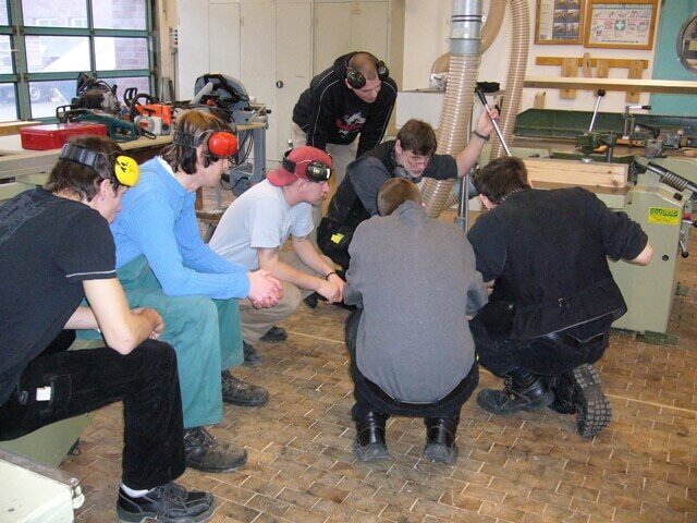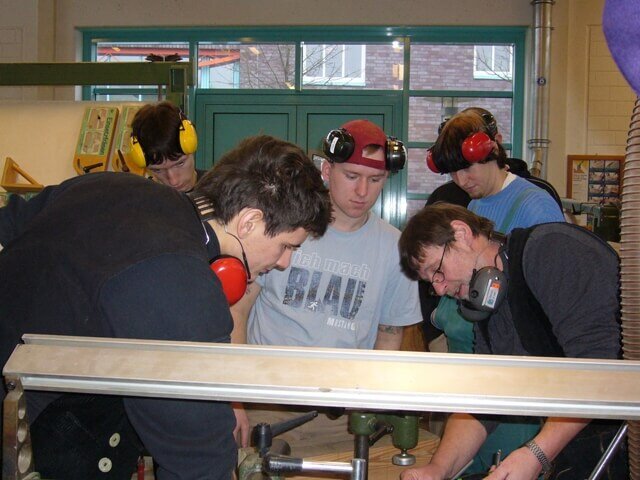 „Wer hier besteht, darf an Maschinen“, so Roland Kimmer. Der Meister und gelernte Zimmerer besitzt die Berechtigung der BG Holz zur Prüfungsabnahme und wird auch die Lehrgangsteilnehmer prüfen. Sie müssen dann zeigen, was sie über den arbeitsschutztechnischen Umgang und den Einsatz von Sicherheits-vorrichtungen an diesen Maschinen wissen und anwenden. Aber gefragt ist auch, was die Praktikanten über den Werkstoff Holz, seine Zerspanung sowie über Aufbau und Funktion von Maschinen und Werkzeugen gelernt haben.