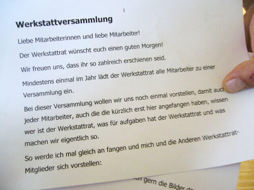 Mindestens einmal im Jahr lädt der Werkstattrat alle Mitarbeiter zu einer Versammlung ein. Bei dieser Versammlung wollten sich die Werkstatträte an den verschiedenen Betriebsstätten der Greifenwerkstatt noch einmal vorstellen, damit auch jeder Mitarbeiter, auch die die kürzlich erst im Geschäftsbereich arbeiten angefangen haben, wissen, wer ist im Werkstattrat, was für Aufgaben hat der Werkstattrat und was machen sie eigentlich so.