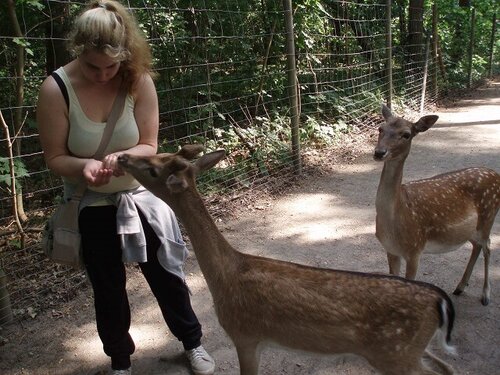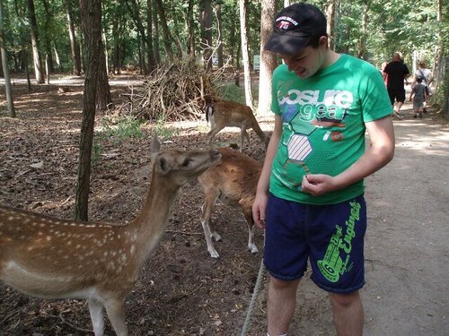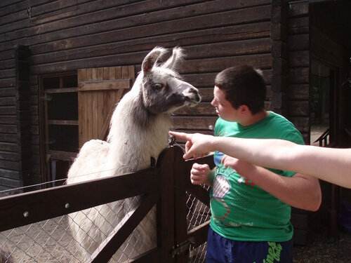 Schon am Eingang begrüßte uns ein Storch, stolz sitzend auf seiner Mühle mit lautstarkem Klappern. Danach ging es an den Löwen, Füchsen und Wölfen vorbei direkt zu den Rehen und Hirschen ins Streichelgehege. Das gekaufte Futter wurde an alle Betreuten verteilt und die Fütterung aus der Hand konnte beginnen. Die Kinder und Jugendlichen lernten hierbei, dass es eine Menge Mut, Überwindung von Ängsten und Entscheidungsfähigkeit erfordert, ein solches Tier aus der Hand zu füttern, sodass sie sich gegenseitig motivierten und am Ende alle ein positives Erfolgserlebnis erfuhren.