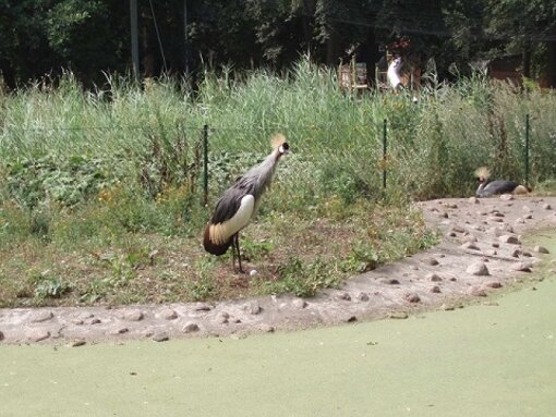 Bevor es mit dem Bus wieder zurück ging und ein spannender Tag in Ueckermünde sich dem Ende neigte, schaute die Gruppe noch bei den Kronenkranichen vorbei - wir informierten uns über die Lebensweise dieser imposanten Vögel.