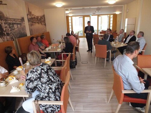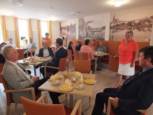 Die Einweihung des Servicehauses am Markt vor einem Jahr mit Tagesstätte Sonnenseite und Wohnungen sowie die Eröffnung unseres Bistro Sonnenseite im März diesen Jahres nahm unser Vorsteher Pastor Dr. Michael Bartels zum Anlass, unsere unmittelbaren Nachbarn des Rathauses zu einem kleinen Date einzuladen. Bei Kaffee und Kuchen informierte er die Anwesenden, unter dem Motto „Weitersagen ausdrücklich erwünscht“, über das Konzept des Hauses und die integrierten Angebote. Schön zu wissen, dass einige der Anwesenden bereits zu Stammgästen des Bistros gehören.