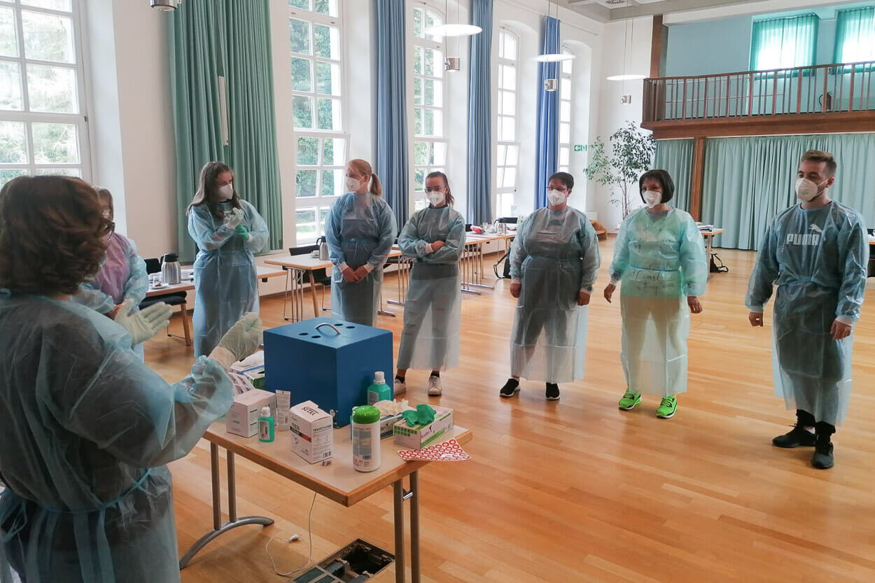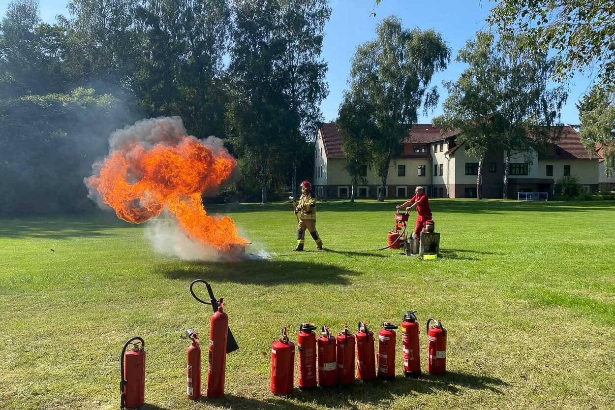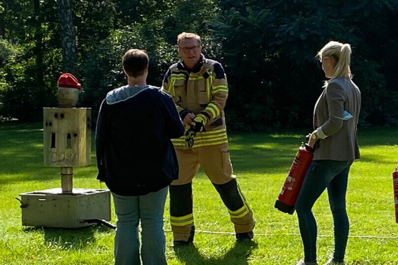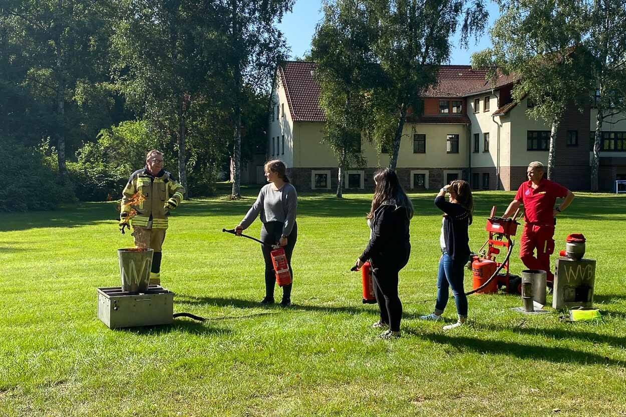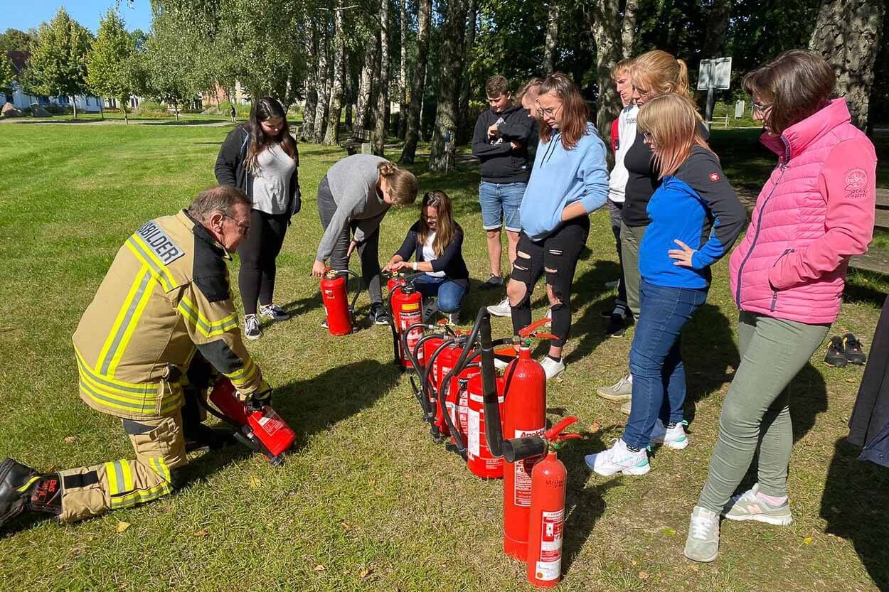 Im weiteren Verlauf der Begrüßungstage wurden dann theoretische Grundlagen, z.B. zum Datenschutz, den Rechten und Pflichten der Auszubildenden und dem Arbeitsschutz erläutert. Aber auch praktische Fertigkeiten im Bereich der Hygiene und der Ersten Hilfe wurden vermittelt. Die Schüler:innen lernten unten anderem, wie man eine Händedesinfektion richtig durchführt. Das Ergebnis wurde dann unter einer Schwarzlichtlampe überprüft und brachte wohl immer wieder mal den gewünschten „Aha“-Effekt. Auch die stabile Seitenlage, das Retten eines bewusstlosen Menschen aus dem Gefahrenbereich und die Herzdruckmassage konnten am Ende der Übungen von allen Teilnehmenden korrekt durchgeführt werden. Unterstützt und angeleitet wurden sie hierbei von Pflegefachkräften des Pommerschen Diakonievereins. Ein besonderes Highlight war außerdem die Ausbildung zum Brandschutzhelfer/zur Brandschutzhelferin, in der jede:r Schüler:in selbst tätig werden und ihren / seinen ersten Brand löschen konnte. Dies geschah unter der fachlichen Anleitung der Brandschutzausbilder Peter Wachholz und Guido Vanauer von der WVB GbR.