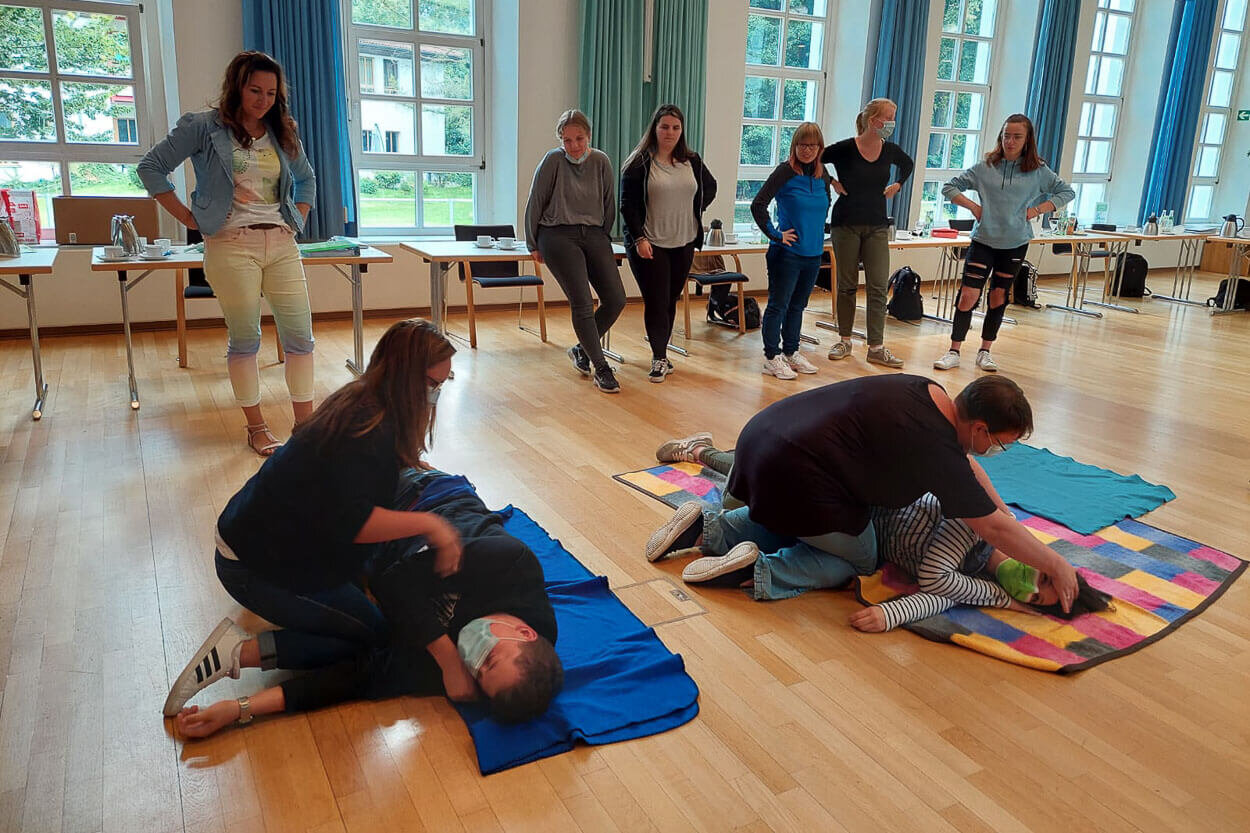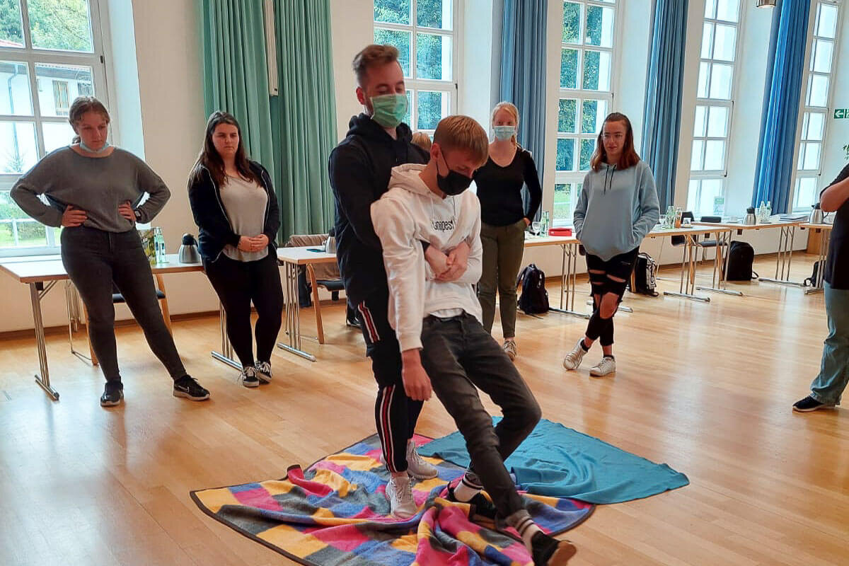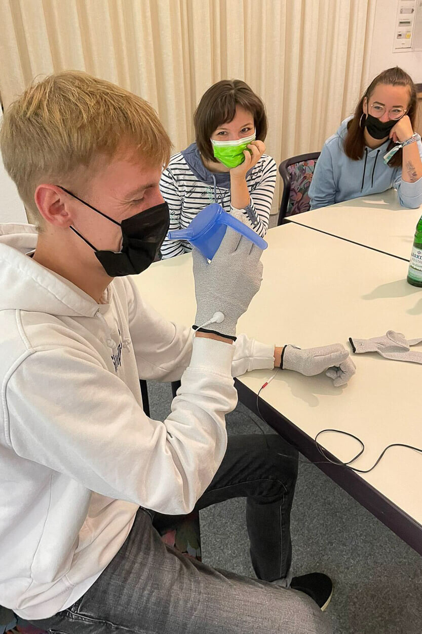 Da den Verantwortlichen der Begrüßungstage aber vor allem wichtig war, dass die Auszubildenden lernen, sich in die Bedürfnisse und Hilfebedarfe der zu pflegenden Personen hineinzudenken und in der täglichen Arbeit einfühlsam und verständnisvoll zu sein, wurden in mehreren Workshops Übungen zum Thema „Wahrnehmung und Achtsamkeit“ angeboten. So hatten die Schüler:innen die Möglichkeit, einmal einen Perspektivwechsel vorzunehmen und in die Rolle einer pflegebedürftigen Person zu schlüpfen, die mitunter schlechter sieht und hört, der aufgrund einer Erkrankung unerwartet die Hände zu zittern beginnen, die auf Hilfsmittel angewiesen ist oder deren Mobilität z.B. durch schwere Beine eingeschränkt wird. Hier kam ein „Alterssimulationsanzug“ der Praxisanleitung zum Einsatz. Des Weiteren wurde das Anreichen von Nahrung simuliert, die Schüler:innen hatten die Möglichkeit, das Liegen in einem Pflegebett auszuprobieren oder wie es sich anfühlt, in einem Rollstuhl gefahren zu werden bzw. selbst zu fahren. Die Angebote wurden lebhaft genutzt und die gemachten Erlebnisse im Nachhinein besprochen und reflektiert.