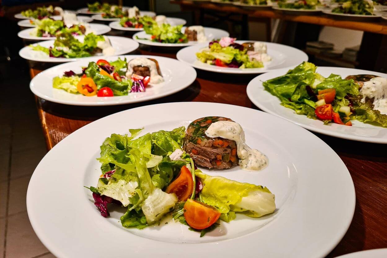Das Team hat viel Erfahrung mit der Ausrichtung von Veranstaltungen und Catering im eigenen Haus. Nun stand es vor der Herausforderung, eine Veranstaltung an einem anderen Ort auf die Beine zu stellen, jenseits der vertrauten Räumlichkeiten und eingespielten Serviceabläufe in Züssow. Für eine festliche Veranstaltung im Skulpturenpark Katzow sollten Tafeln und Tischdeko aufgebaut und das Catering mit Bewirtung durchgeführt werden. Für 108 Gäste wurden Bestecke, Teller, Tischdecken, Gläser und vieles mehr benötigt, in Kisten verstaut und transportiert.