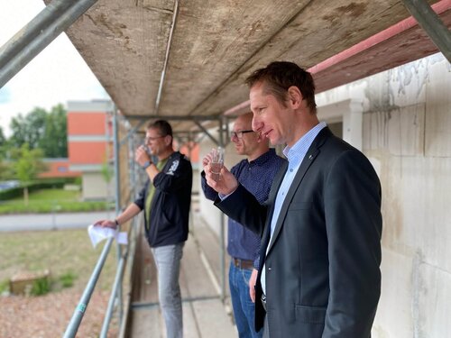 Vorsteher Dr. Michael Bartels und Regionalleiter Frank Jager nahmen die anwesenden Gäste in ihren Ansprachen mit auf einen Exkurs zum bisherigen Bauablaufgeschehen, Hintergründen für das aktuelle Bauprojekt und gaben Ausblick auf die künftige Inbetriebnahme des neuen Wohnangebotes.