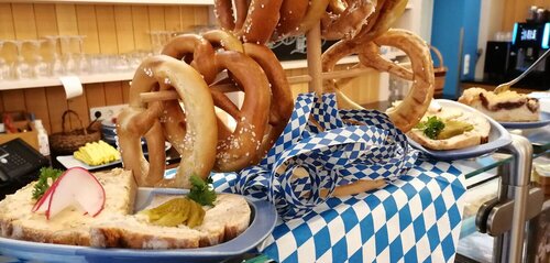 So standen an diesem Tag bayerische Kartoffelsuppe mit Weißwurstscheiben, gebackener Leberkäse auf Bayerisch Kraut, leckere Brez’n sowie Krustenbrot mit Schmalz und Obazda auf unserem Speiseplan. Für den süßen Genuss hatten wir natürlich auch gesorgt und unsere Gäste freuten sich über unseren hausgebackenen Zwetschgendatschi.