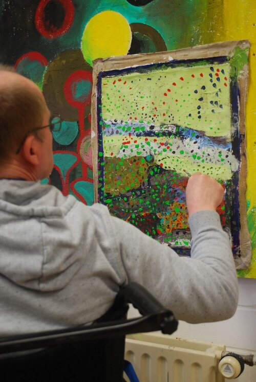 Hier im Atelier arbeiten Menschen mit geistigen und psychischen Beeinträchtigungen künstlerisch zusammen. Das funktioniert sehr gut, da der Arbeitsbereich keine starren Prozesse vorgibt und sich der einzelne frei entfalten kann. Die Mitarbeitenden tuen sich untereinander gut, sie können sich gegenseitig über die Schulter gucken und profitieren voneinander.“