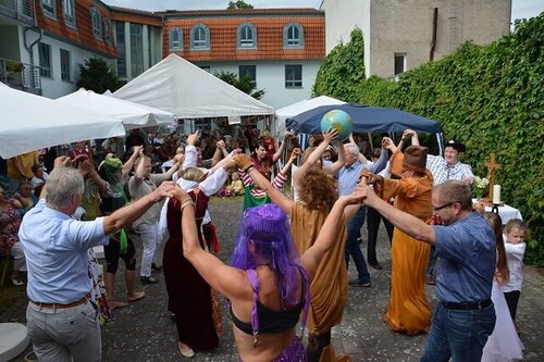 Im Anschluss war es dann Zeit für die Auftritte der Mitarbeitenden. Mit viel Mühe und Ideenreichtum hatten sie in ihrer Freizeit eine tänzerische Weltreise vorbereitet. Ob Kasatschok oder Sirtaki, lassoschwingende Cowboys oder hüftenschwingende Bauchtänzerinnen, ob „König der Löwen“ oder Pippis „Herr Nilsson“ – alle Darbietungen wurden mit viel Freude und Enthusiasmus aufgeführt und animierten das Publikum zum Mitklatschen und -tanzen. Krönender Abschluss war der gemeinsame Tanz aller Beteiligten unter dem Motto: Wir sind alle Menschen einer Welt – egal welche Sprache wir sprechen oder Hautfarbe wir haben. Zu diesem schönen Finale wurden auch einige Gäste zum Tanzen aufgefordert. Neben anderen kamen Dr. Michael Koch und Ernst Wellmer dieser Aufforderung gerne nach.