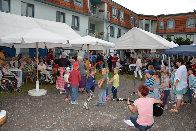 Am 30. Juni 2016 feierte das Gertraudenstift in Demmin sein traditionelles Sommerfest und zugleich sein 21-jähriges Bestehen. Bei angenehmen Temperaturen kamen Bewohnerinnen und Bewohner, Mitarbeitende und zahlreiche Gäste zusammen. Nach einer Andacht gab es bei Kaffee und Kuchen Zeit, miteinander ins Gespräch zu kommen. Großes Thema unter anderem: Würde das Wetter halten? Dunkle Wolkenberge türmten sich immer wieder drohend auf und waren zwischen den schützenden Pavillons zu entdecken, aber: Es blieb trocken. So ließen es sich alle gut schmecken. Vor allem die frisch zubereiteten Hefeschnecken, die Küchenchef Dietmar Haas nur zu besonderen Anlässen bäckt, wurden viel gelobt.