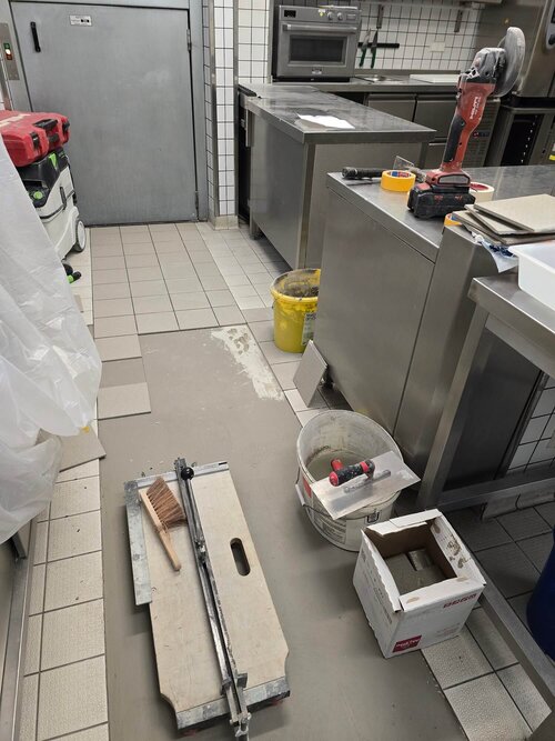 Deshalb haben unsere Gäste in der vergangenen Woche etwas Verständnis aufbringen müssen. Die Küche blieb an drei Tagen kalt. Mit etwas Improvisation gelang es uns dennoch ein reduziertes Frühstücks- und Mittagsangebot sicherzustellen. Während in der Küche auf den Hauptlaufwegen neue Fliesen verlegt wurden.