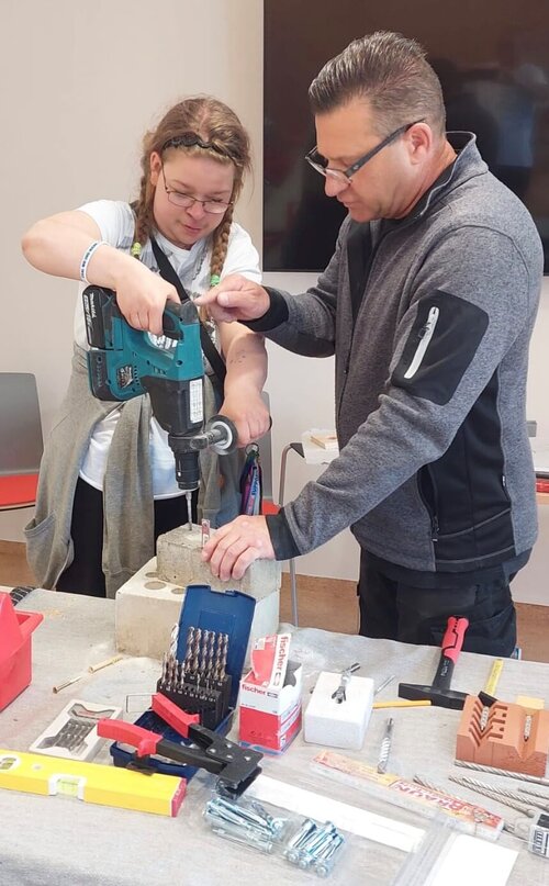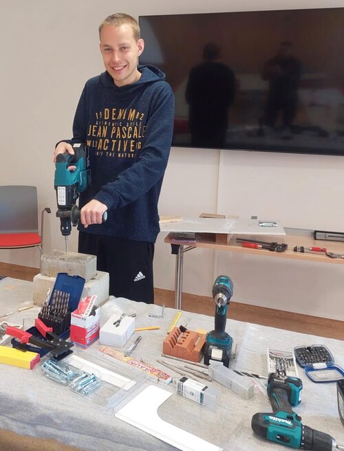 Tom, normalerweise bekannt für seine aufgeregte und leicht ablenkbare Natur, war an diesem Tag erstaunlich konzentriert und ruhig. Mit einem festen Blick nahm er die Mustertafeln zu den verschiedenen Befestigungstechniken in Augenschein: Nageln, Schrauben, Nieten, Kleben und Dübeln. Er wollte unbedingt seine handwerklichen Fähigkeiten verbessern und sich die Tricks und Kniffe des Profis Jens Schenke, Leiter der Haustechnik in der Greifenwerkstatt, aneignen.