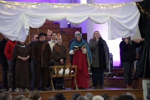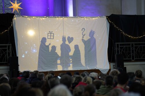 Traditionell wirken an den Vorbereitungen für diesen Tag viele Akteure mit. Insbesondere an der Darstellung der Weihnachtsgeschichte, welche in diesem Jahr durch Mitarbeitende und Teilnehmende des BerufsBildungsWerkes erzählt wurde. Licht und Schatten, begleitet durch Musik und Gesang nahmen die Anwesenden mit nach Bethlehem und der Geburt Jesu Christi. Die Weihnachtsgeschichte als Schattenspiel, eine Erfahrung, die eine ganz neue Sicht auf das Weihnachtsfest gibt. Denn sie regt zum Nachdenken über die Sicht auf die Dinge an. Licht und Schatten bestehen dauerhaft nebeneinander aber durch das Aufleuchten des göttlichen Lichts finden wir Orientierung.