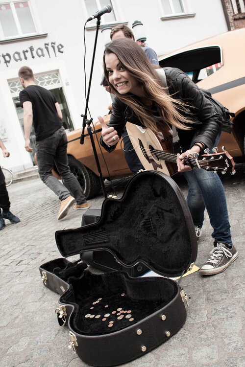 Redaktion: „Du warst ne Zeit lang auch als Straßenmusikerin unterwegs. Welche Erfahrungen hast du dabei gesammelt?“
