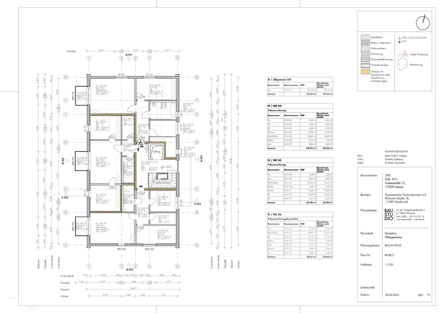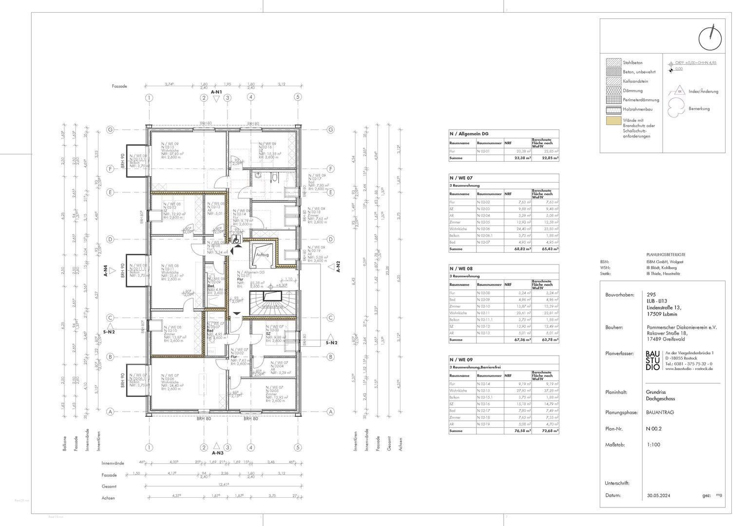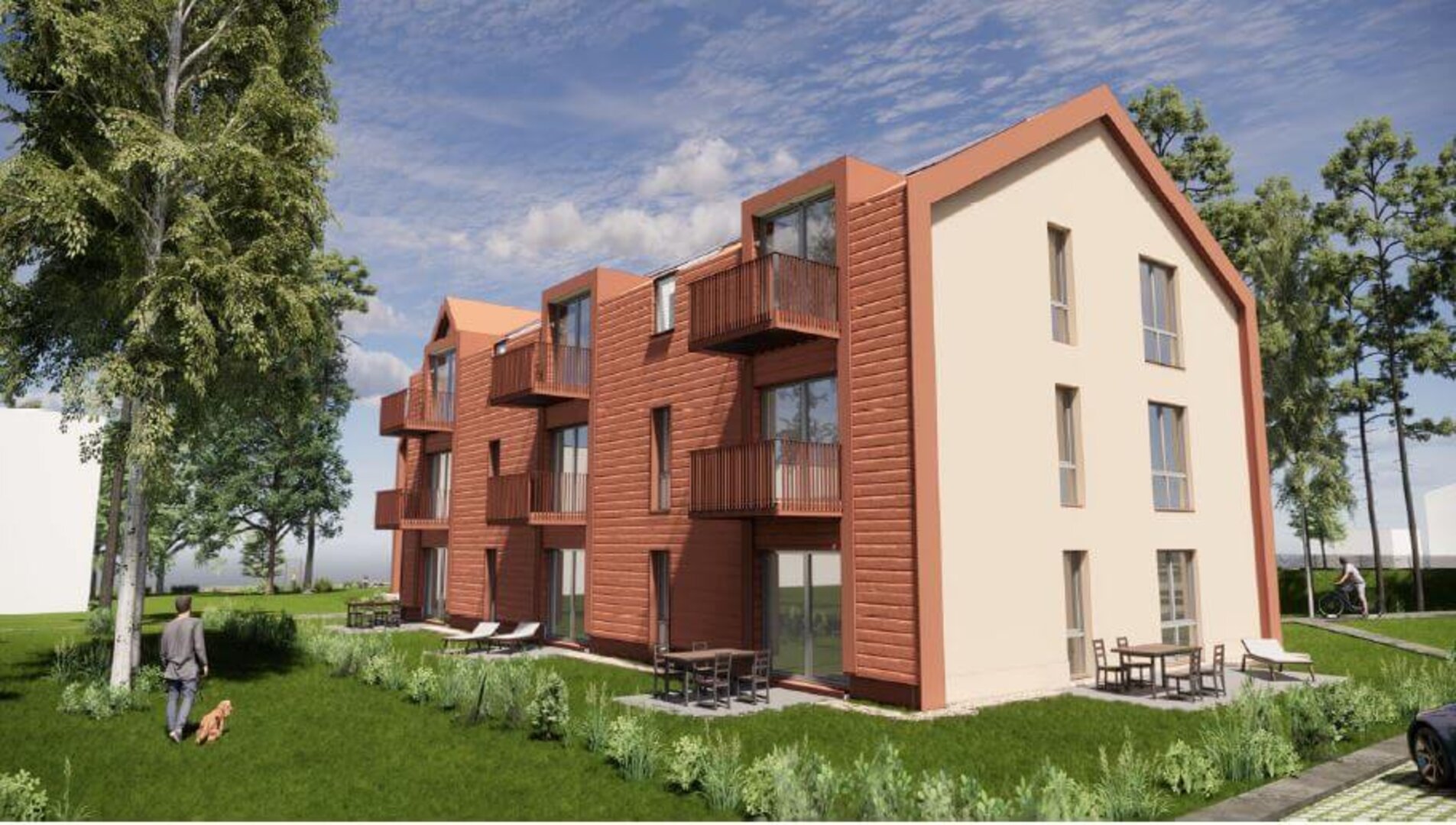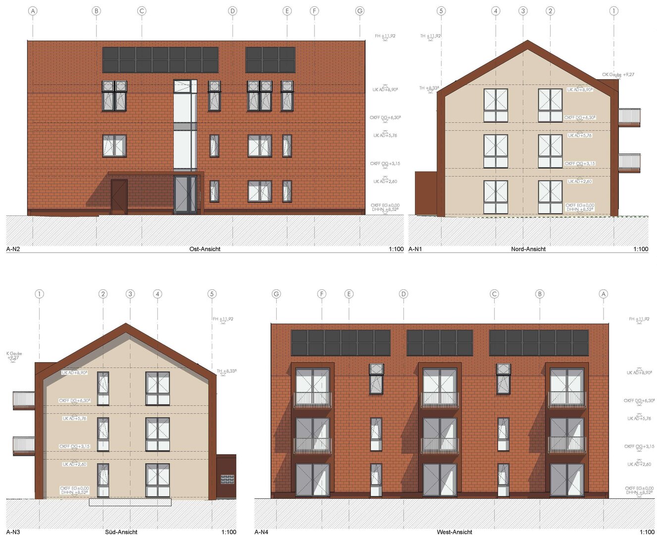Der Neubau wird in Holzrahmenbauweise realisiert und umfasst neun zusätzliche Wohneinheiten. Auch hier ist die barrierearme und barrierefreie Ausgestaltung ein zentrales Planungsmerkmal: Sechs Wohneinheiten sind barrierearm, drei barrierefrei vorgesehen.